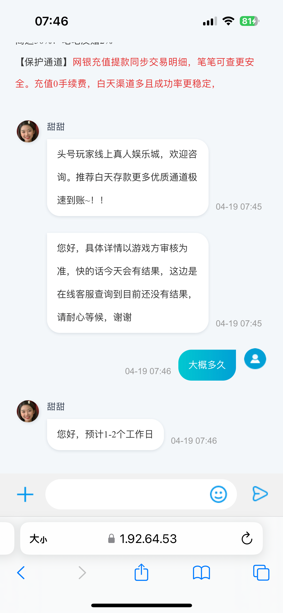 我的快3个小时还没好,今天接到电话才来的都没犹豫问清楚活动规则就充值了,198+200,提的680,200优惠券打pp电子输光后我才把本金转进游戏里,本金都差点输光,最后爆了,希望不会黑我