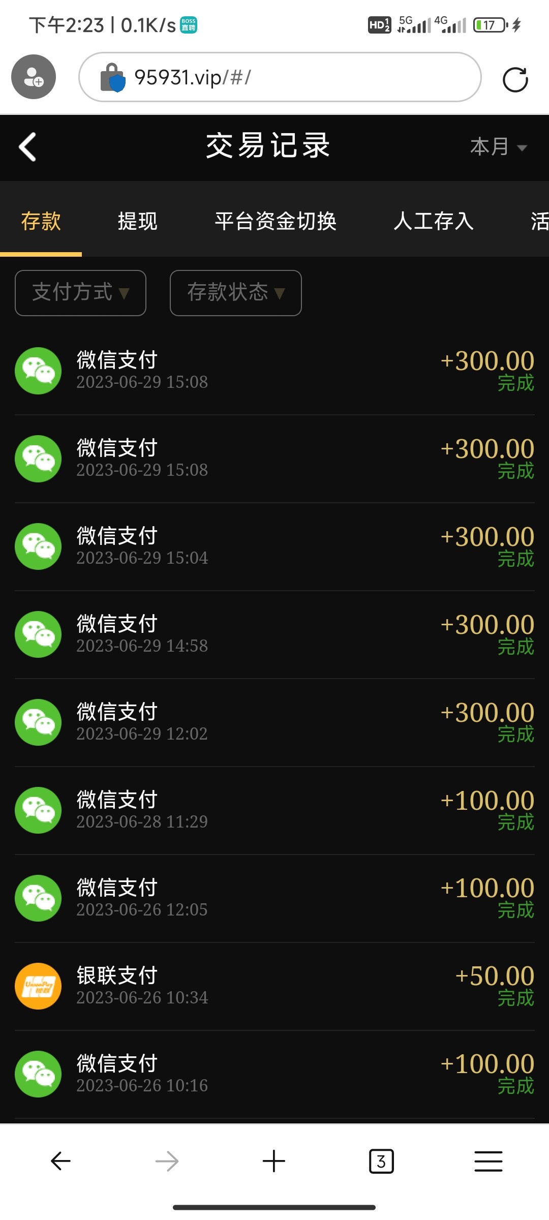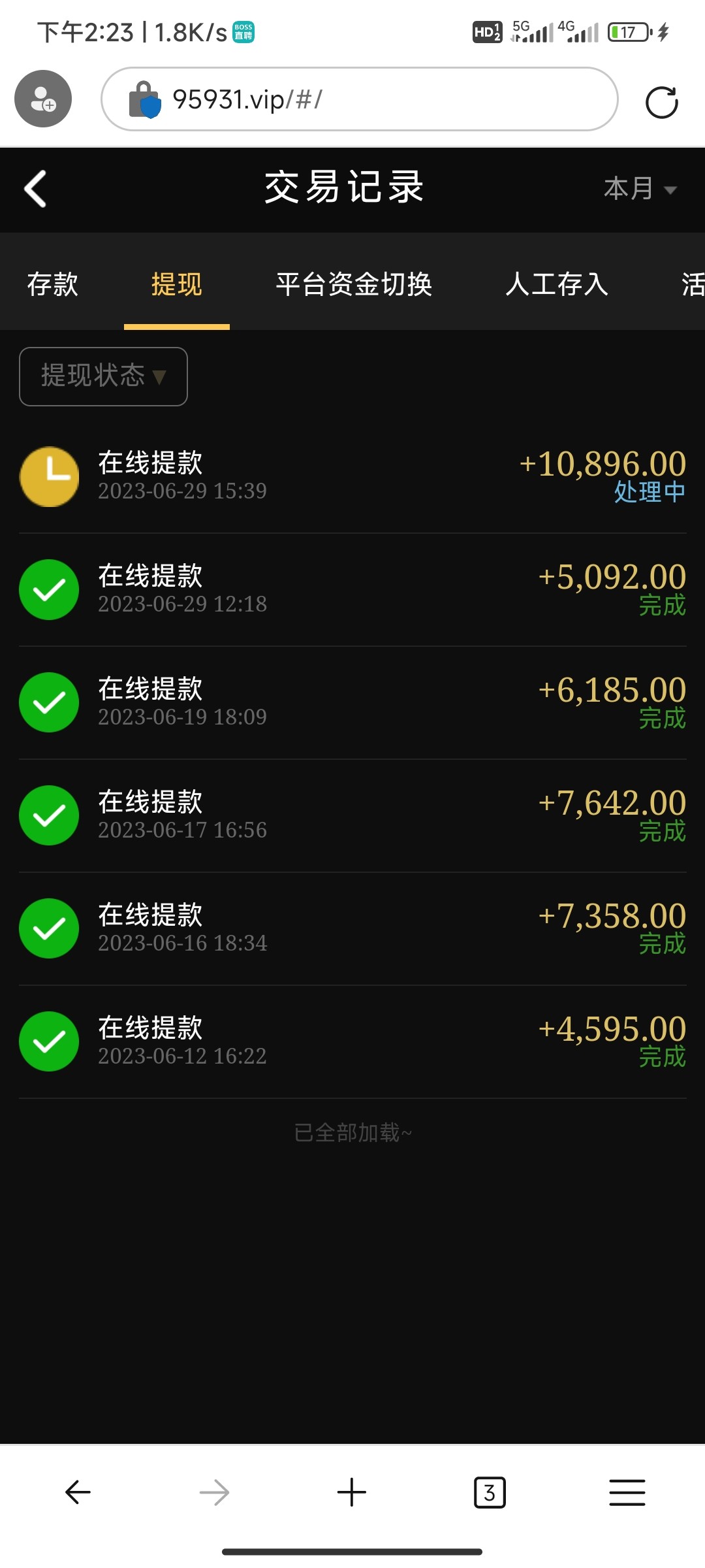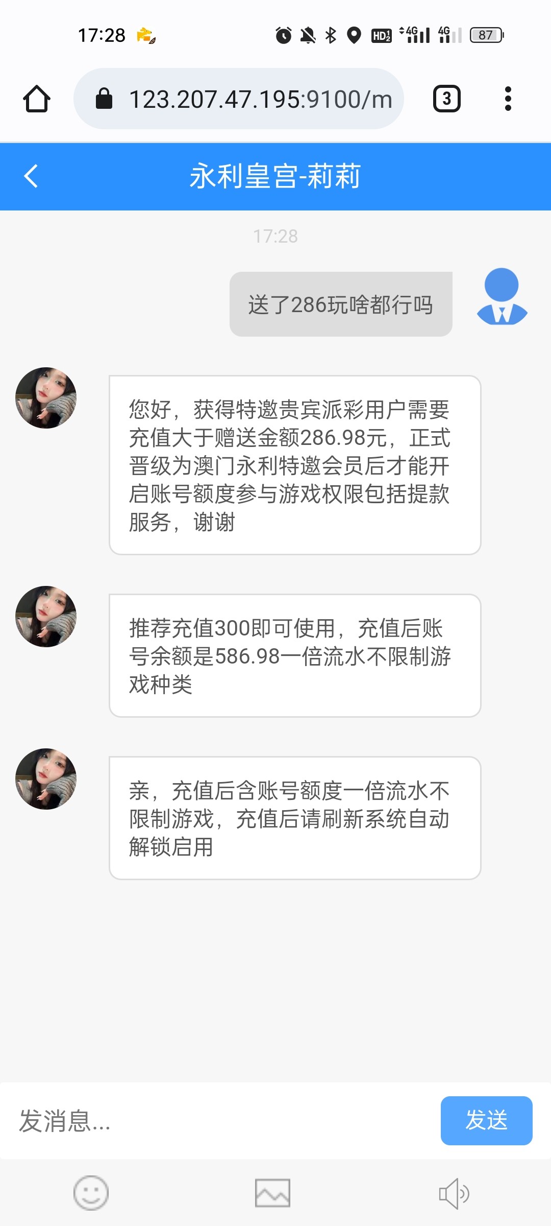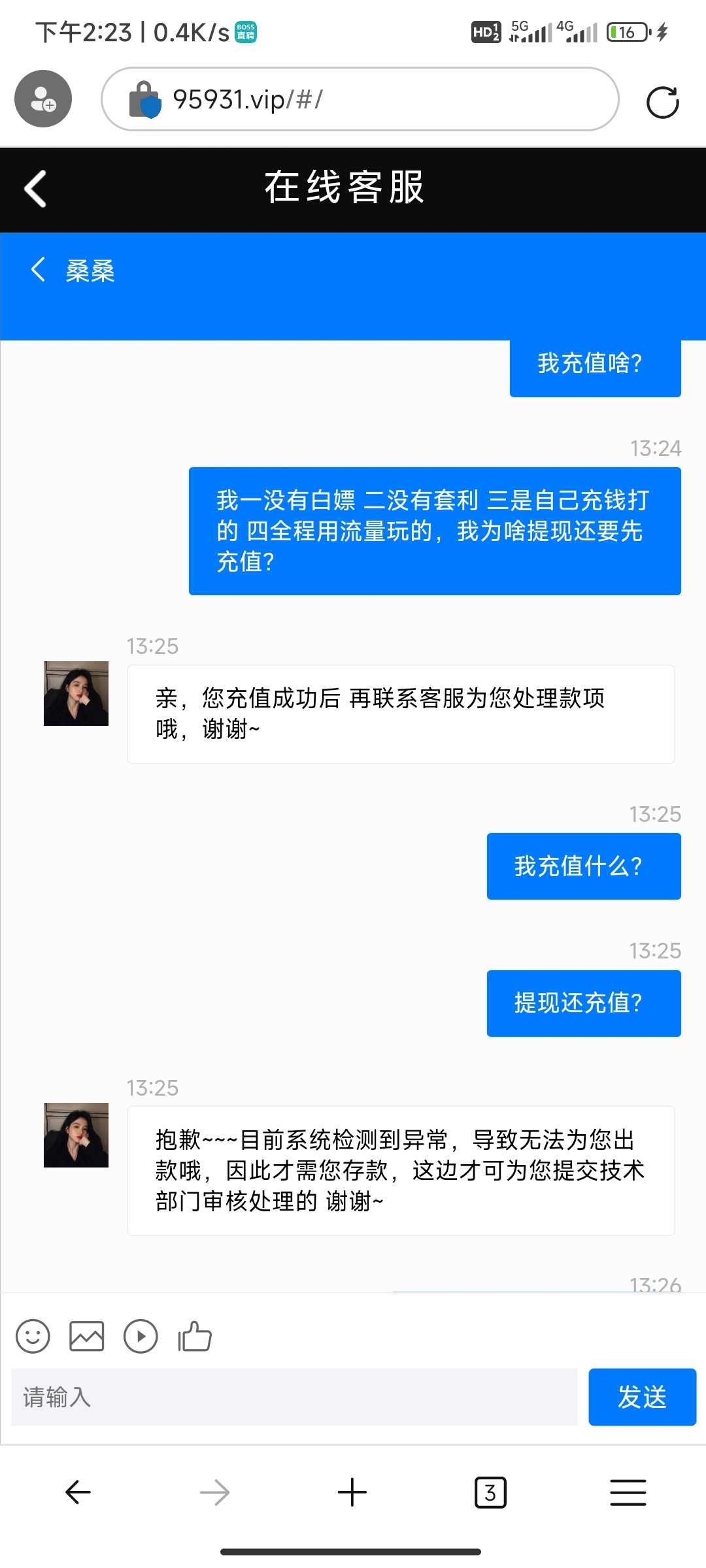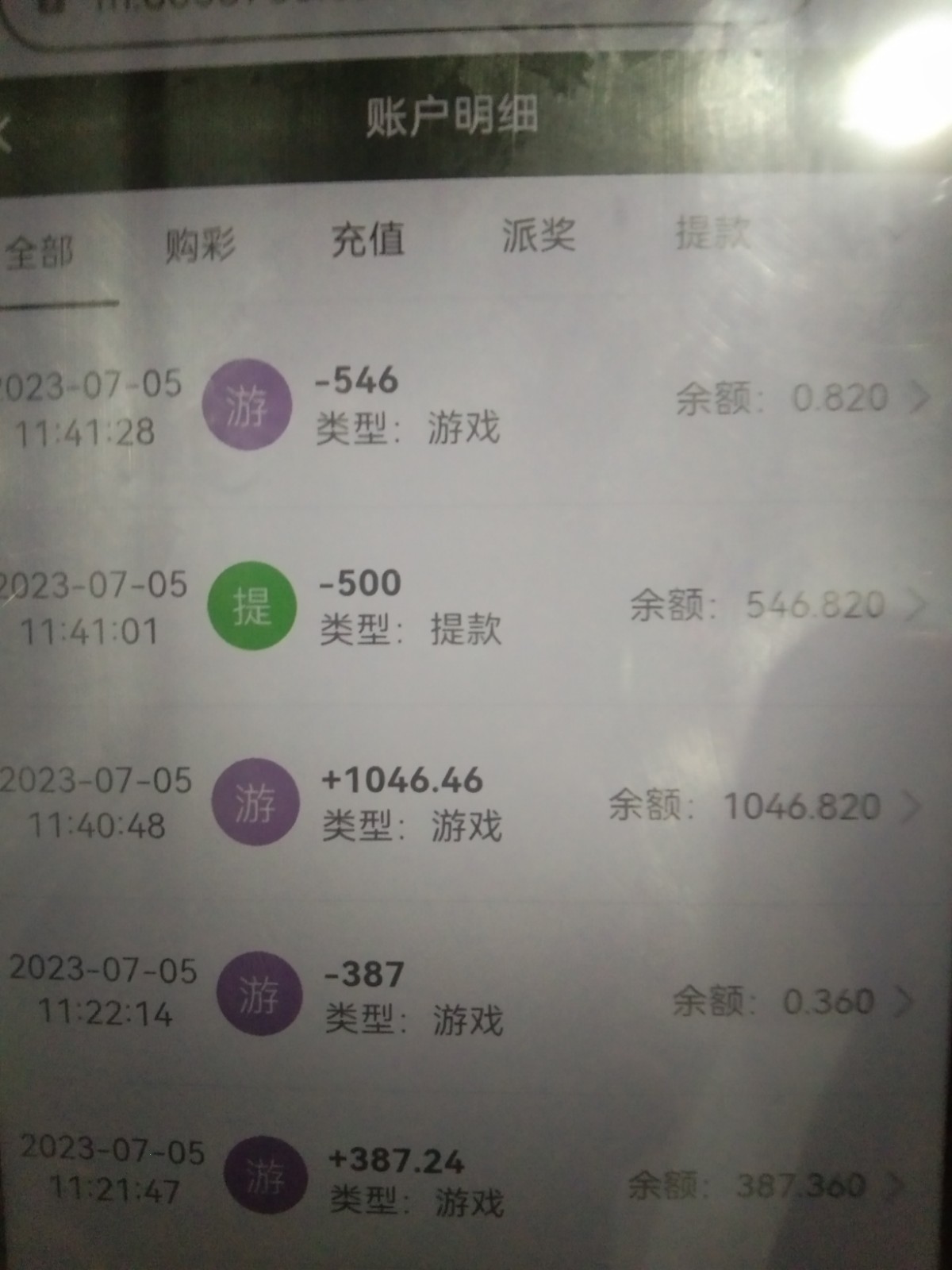 这个台子去年玩玩过几次,也让赢,但是当时忍不住收手都下去了,算起来输了有几千块钱吧,今天给我打电话说有神秘彩金,388-8888,加了联系方式后说要存款,送500,第一次送百分之二十,我想就充个五百块钱吧,送我一百赢他个几百就下,结果必须得充值后再取款才送,我尼玛这套路,不过还好赢他2k,取款几十秒到账,逼套路实在太深,我要回农村。