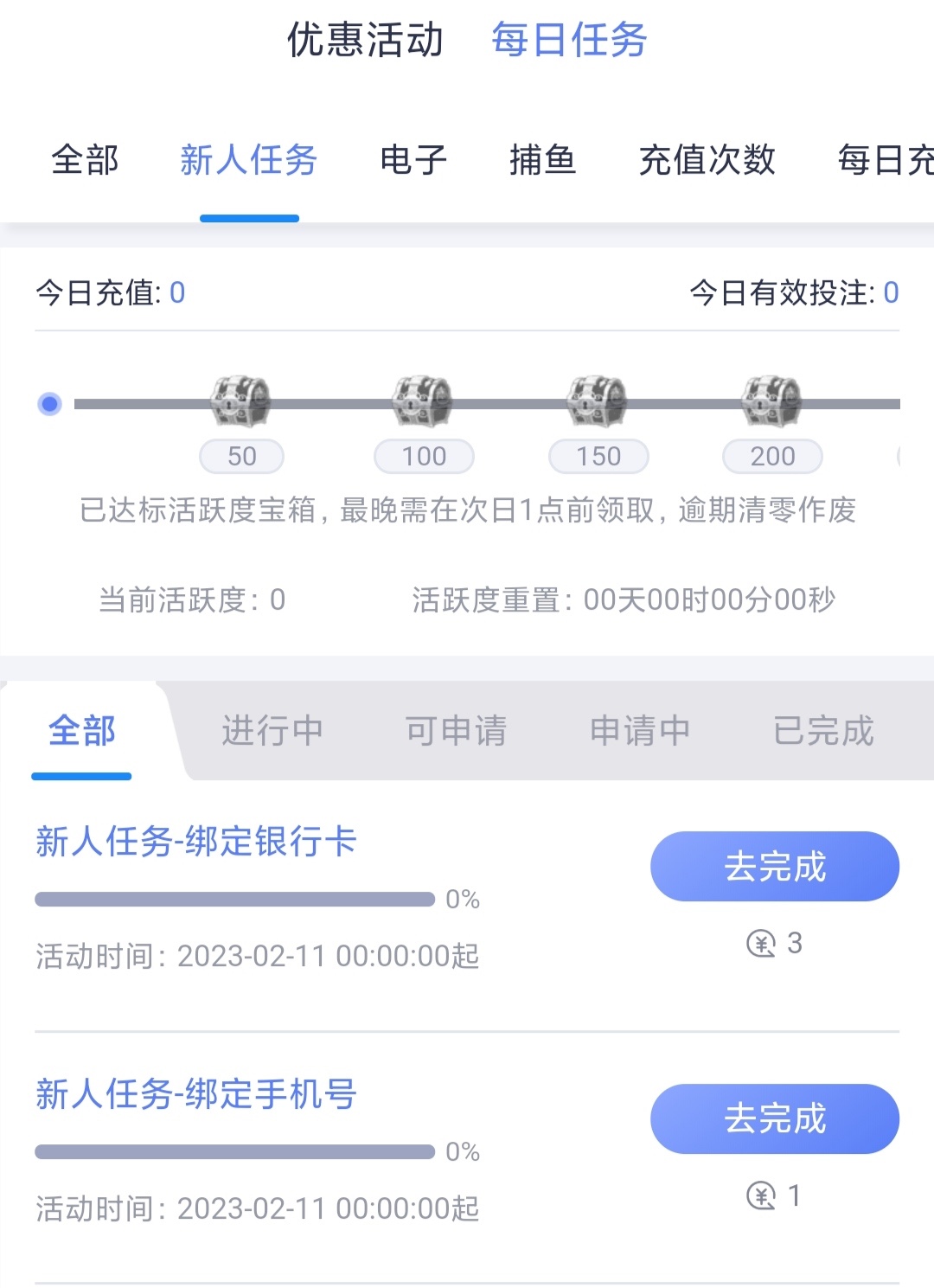 新用户注册完善资料【优惠活动】——【每日任务】新手那里秒领4,好像有些平台数据是互通的自己看一下吧,最低100提现。希望老哥们多多分享本站,叫上朋友一起撸,干翻狗庄。