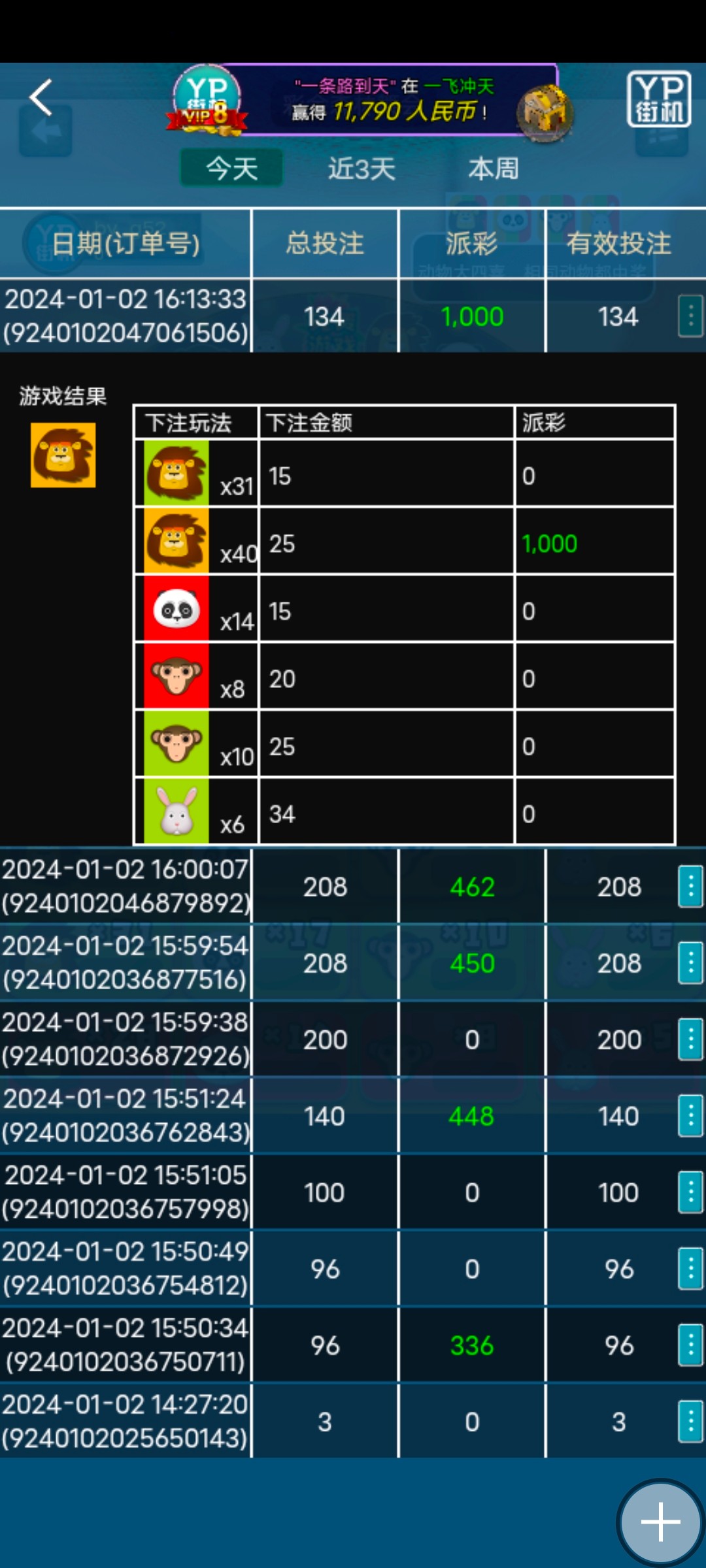 老哥们问我玩的啥,我在这说我玩的ag街机买的财富转盘3元梭哈红骰子直接×55倍 然后165买单人彩金森林舞会,注意不是单人森林舞会,是单人彩金森林舞会,直接上700 然后准备提了没忍住打了2把pg免费嘎嘎杀 接着剩下200多又去单人森林舞会,压中黄色狮子 直接上1000 上图