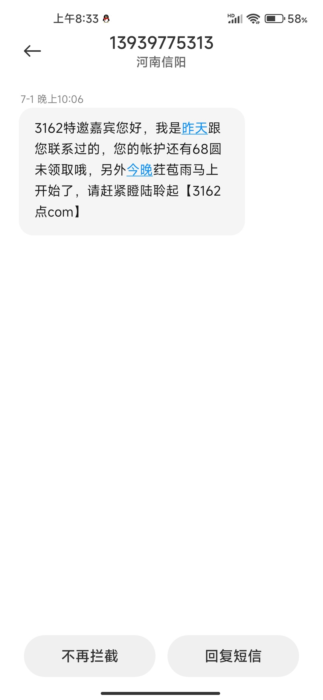 3162特邀嘉宾您好,我是昨天跟您联系过的,您的帐护还有68圆未领取哦,另外今晚荭苞雨马上开始了,请赶紧瞪陆聆起【3162点com】