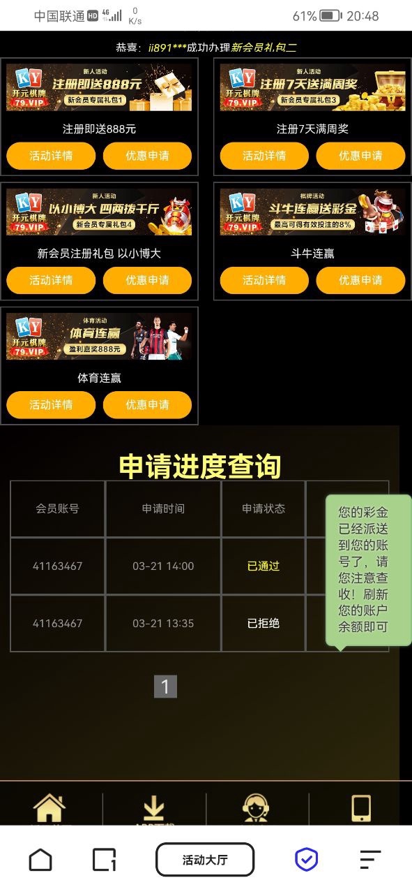新用户下载APP绑定银行卡,活动大厅自助申请8彩金,最低100起提现。