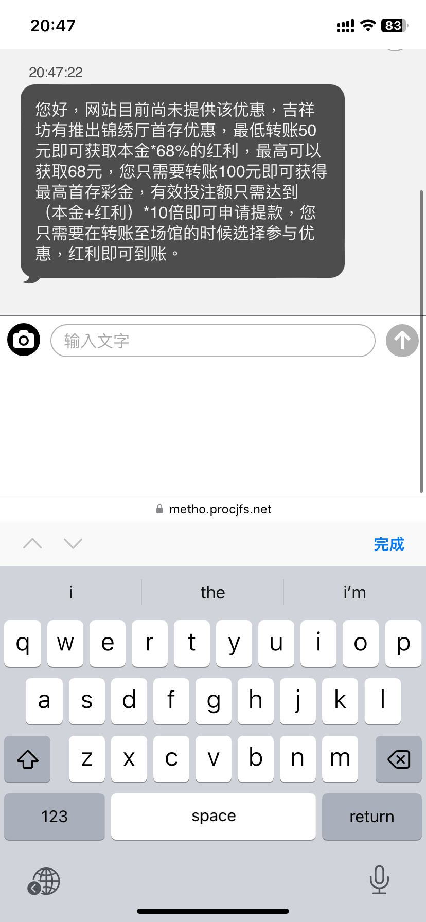 您好,官网目前没有相关优惠,建议您可以咨询信息来源的发帖人员或是论坛客服人员,同时,吉祥坊有推出锦绣厅首存优惠,最低转账50元即可获取本金*68%的红利,最高可以获取68元,您只需要转账100元即可获得最高首存彩金,有效投注额只需达到(本金+红利)*10倍即可申请提款,您只需要在转账至场馆的时候选择参与优惠,红利即可到账。