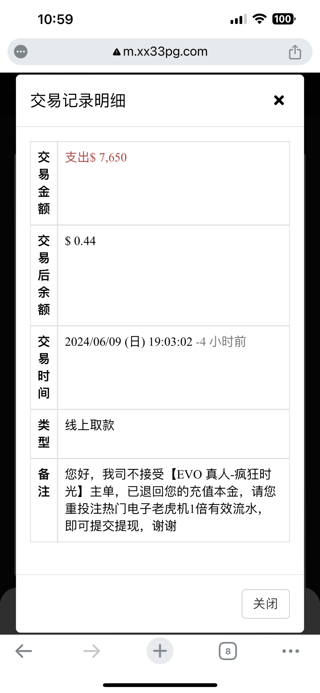 避雷33pg.com黑款7650元