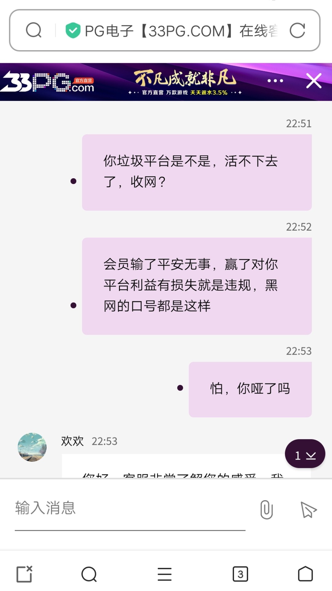避雷33pg.com,冲了一共2700,提款7650直接黑款,理由不接受此注单,提款的时候联系客户,客户说财务正在处理出款,然后过了一小时半,确实处理出款了,给我盈利的钱扣掉了,给我退1000本金,让我强制玩电子,并且重新打码一倍流水,就因为在他们平台是新用户,没有负盈利,玩转盘进了个100倍,不敢给出款,一点格局都没有的平台大家记得避雷,去其他平台今天输一万,果然还是黑台好赢钱,现在赌的我真犯恶心,输的时候一直输,赢的时候各种理由卡你款,网络赌博就是诈骗,冲了不一定赢,赢了不一定给,给了不一定出,出了还冻你卡,恶心至极,当冲钱让大家见识一下黑台了,一定记得避雷,帮忙骂客户的留下收款码给你们红牛