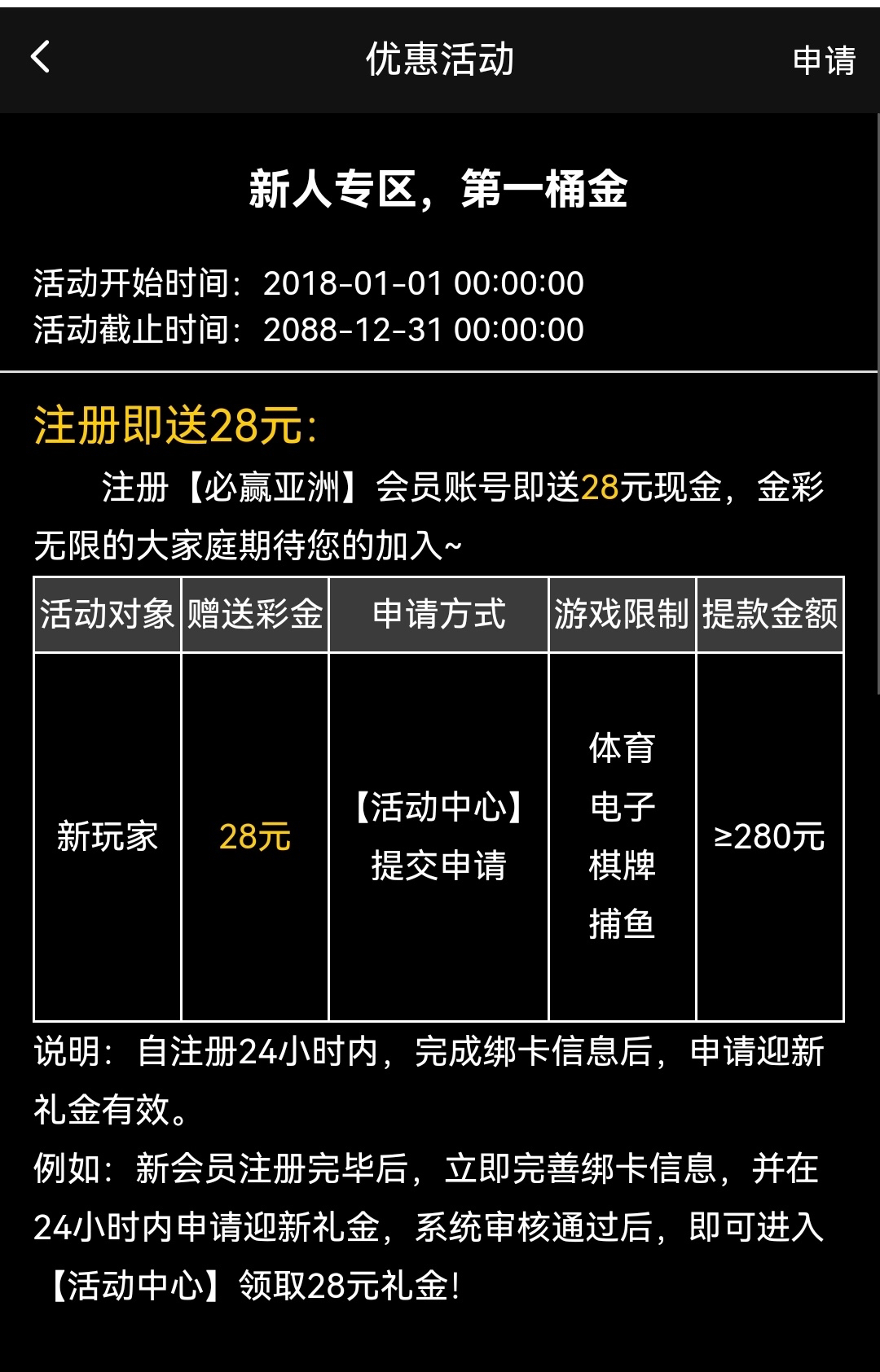 活动:新用户注册绑定信息下载app送28/280提,活动里申请,注意游戏限制