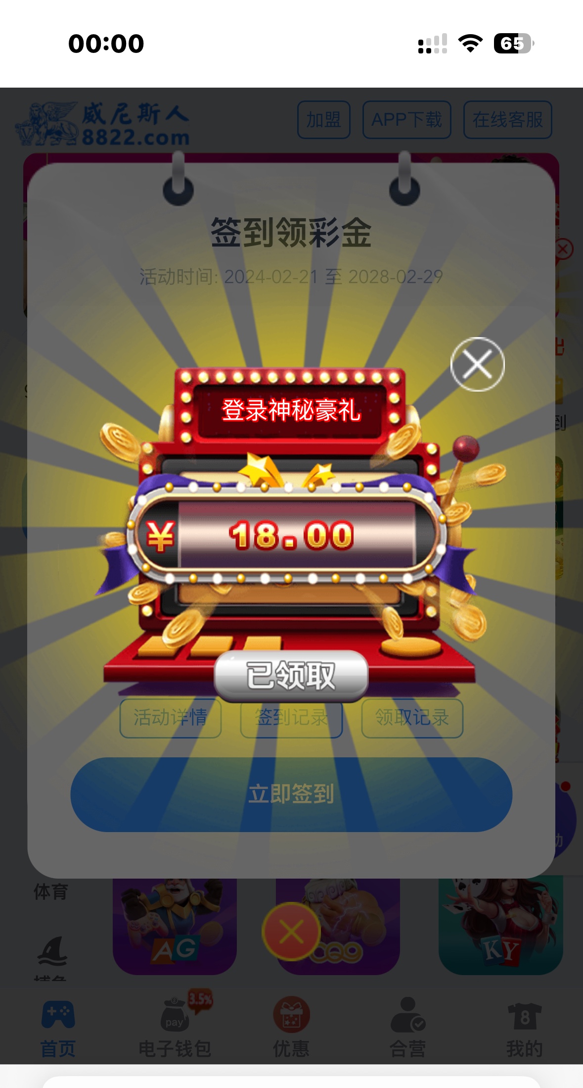 不知道是不是充值过的才有,每天都可以免费签到,提款已验证了