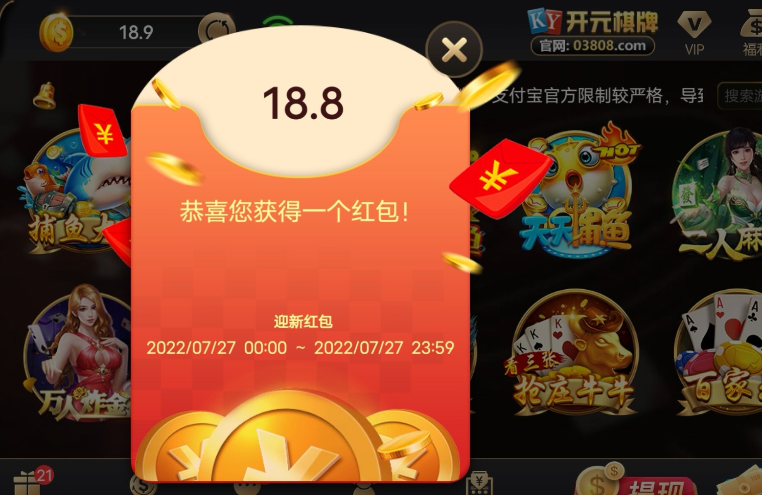 活动:老用户有号的登入首页自动弹出红包,群友反馈领了18