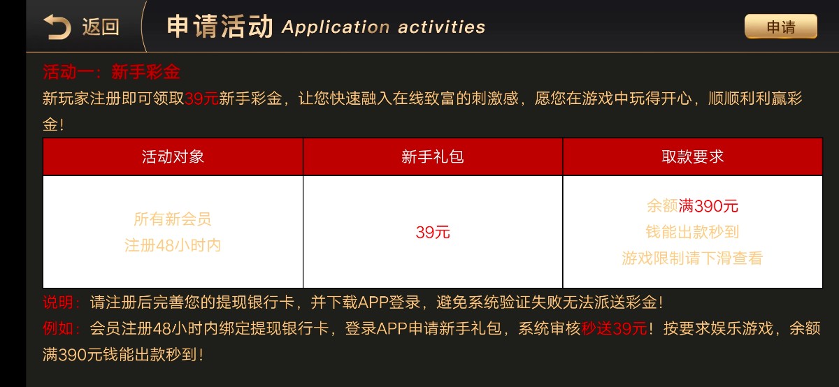 新人下载APP注册绑卡去活动中心申请APP彩金19元,注册彩金好像是系统自动赠送,一定要在48小时之内申请,有就有没有就无视。