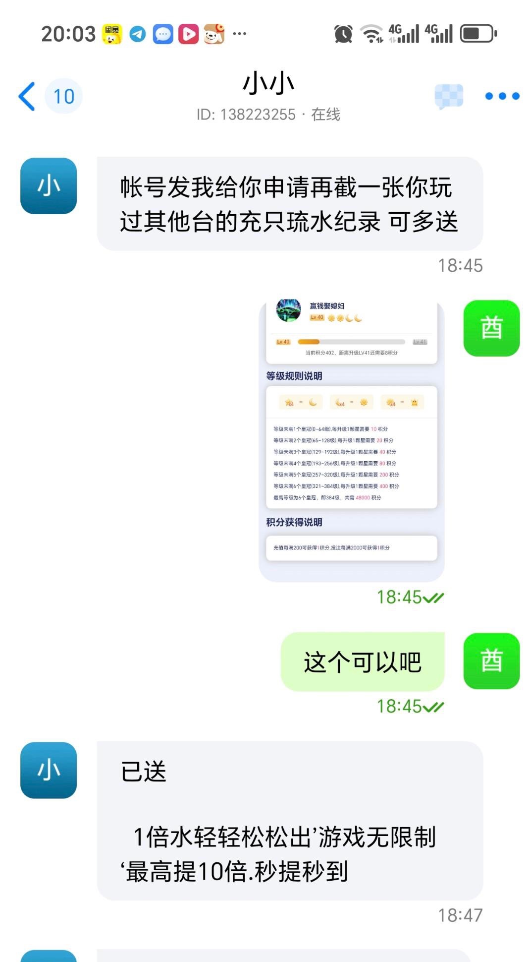 特邀网址14t.fuzhlnx.top 打开联系蝙蝠或者三条客服领取他会给你发注册网址和邀请码 给他一张其他平台的流水截图就行我给的是28圈等级截图送了48一杯流水提款最高提彩金10倍我没打出来 赶紧去现在应该不查