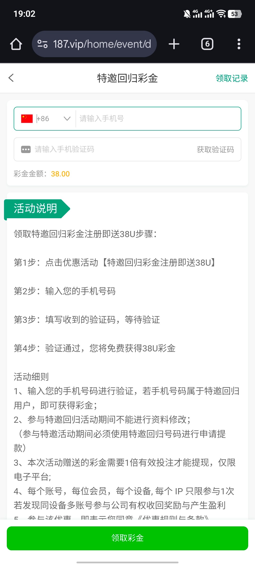以前注册过账号的 有号登录上去 查看是不是符合回归彩金 送38U