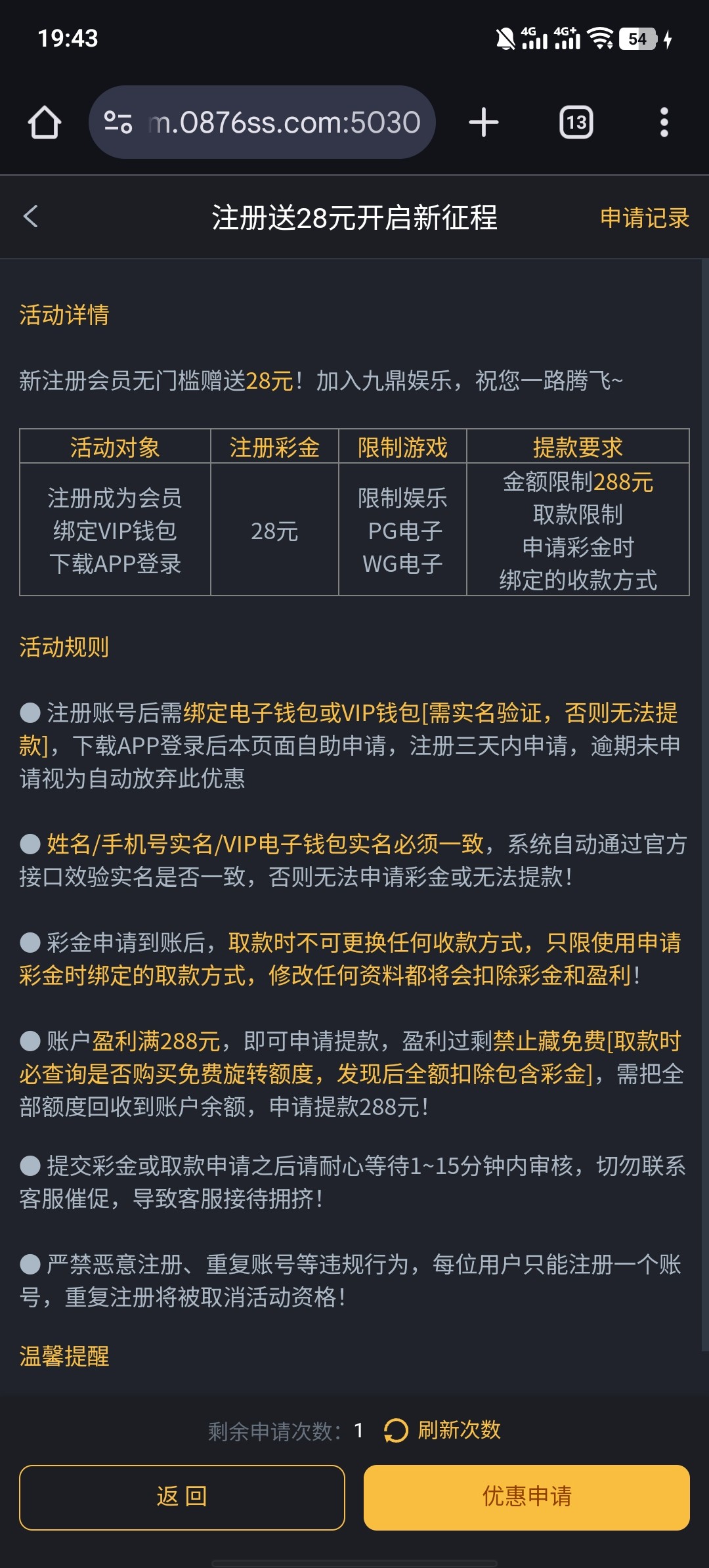 新用户注册绑定电子钱包下载APP优惠大厅自助申请28/288提,彩金限制自行查阅网站咨询客服
