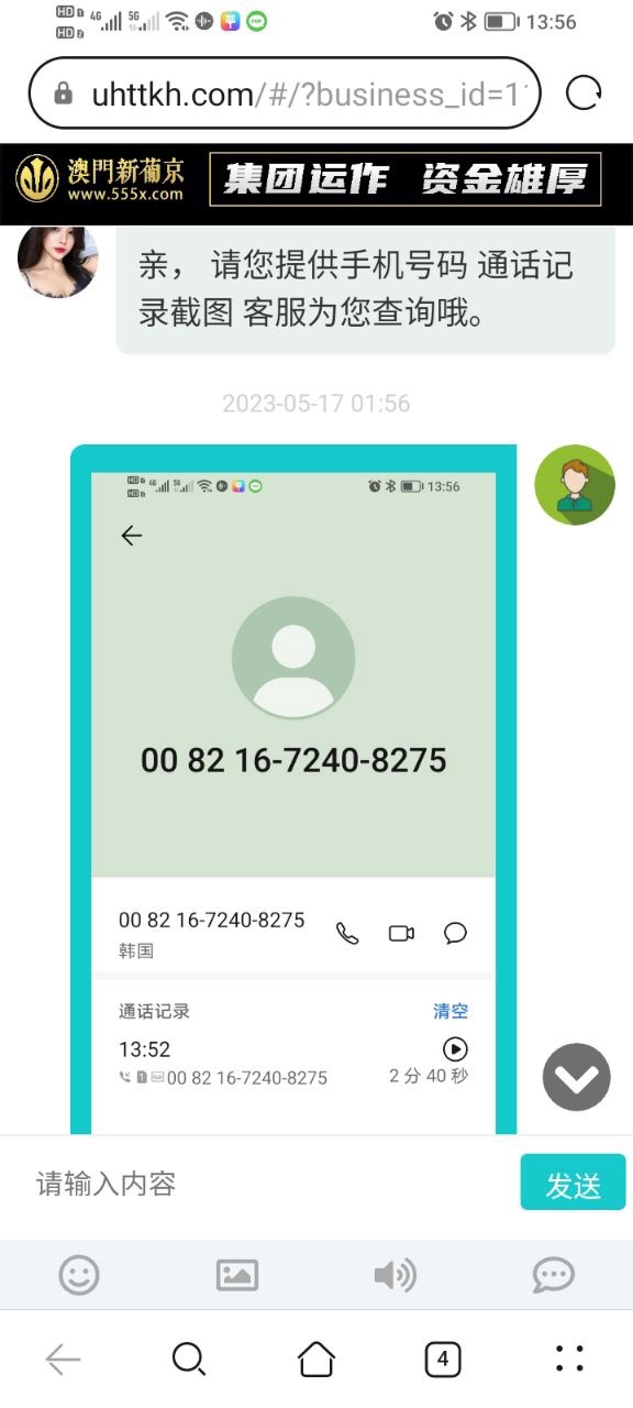 特邀碰瓷 联系客服申请特邀彩金送38 随便给一张境外电话截图