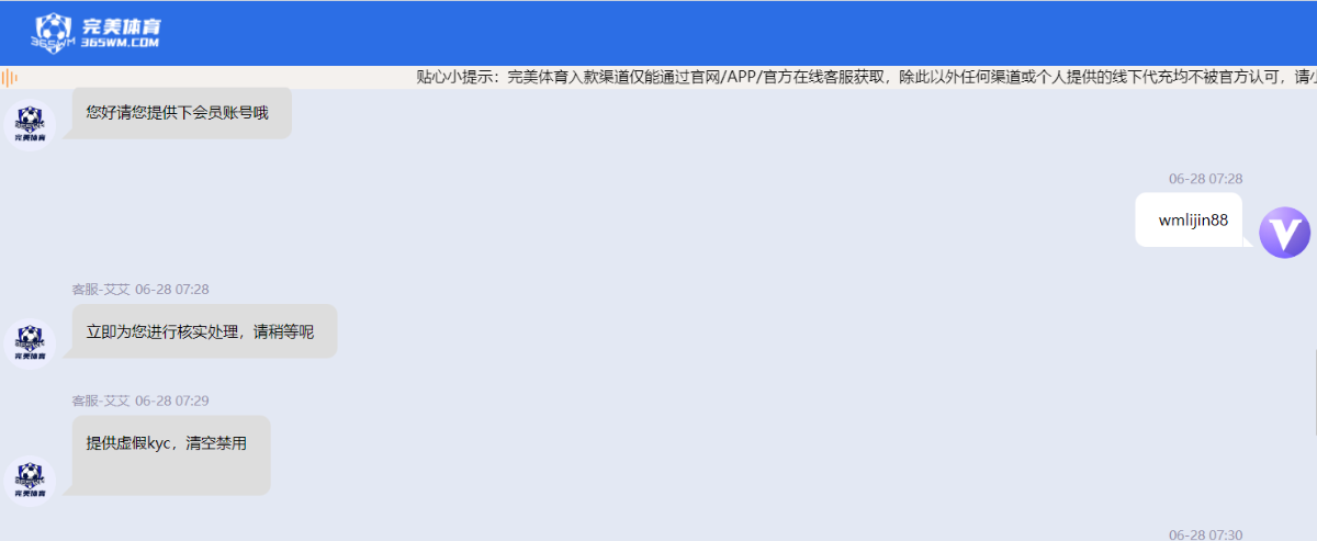 在代理线下注册,黑平台完美体育充值一万元直接被黑,第一次提款100元到银行卡,第二次提款11985元失败,需要提交身份证和银行卡审核,提交完后说是供虚假kyc,清空禁用,现在账户登录不上去了。所谓的kyc为反洗钱,笑话了,一个赌博网站,还反洗钱。保真正常玩的游戏,绝对没有违规。再次曝光这个黑平台,黑网站!请大家擦亮眼睛,不要再上当受骗。请求网站多曝光,让黑平台早点破产。