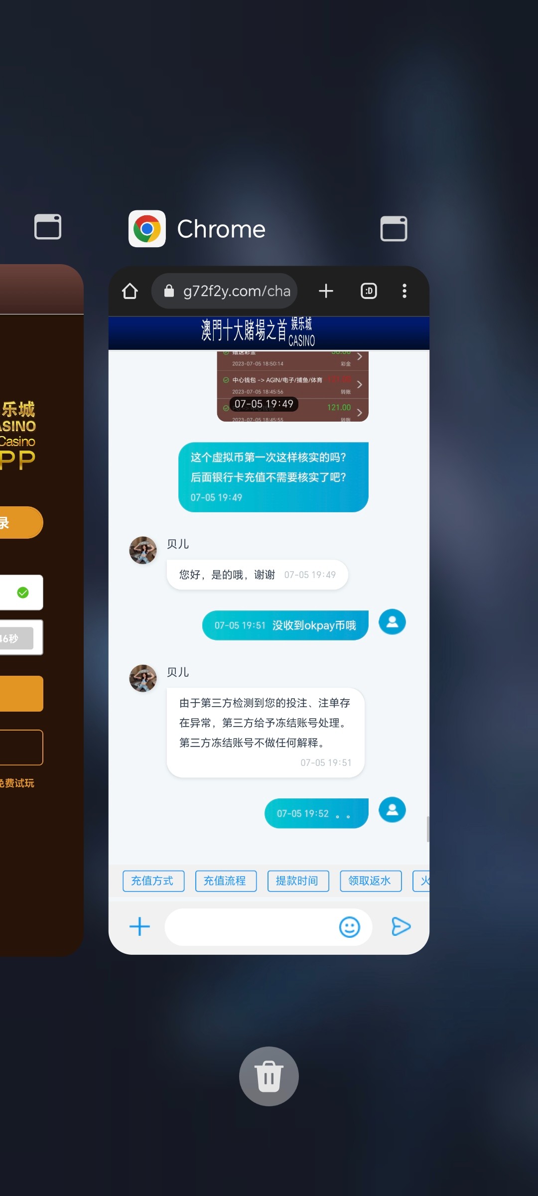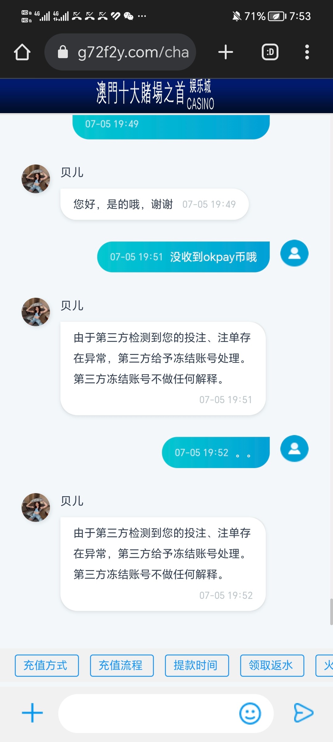 最开始打电话送8彩金注册账号了,添加pop人员,充值了100输了,打了一千多流水,然后第二次充值了100天天赖电话,就玩了,100送38app彩金,38彩金过了两关,提款了,然后取款密码提前被平台改了,我还不知道是黑平台,然后找客服,客服给我通知那边打电话改了,改了提款okpay.提了然后又电话,电话和我核实完,问要不要代理,我说不做,然后把电话挂了后,一直登录我账号,登录就被挤下去,再登录显示登录密码错误,短信验证码登录显示账号被封禁,哈哈,客服秒变成机器人,然后pop四五个客服人员秒删我,不是这点钱问题,这平台操作太恶心了,