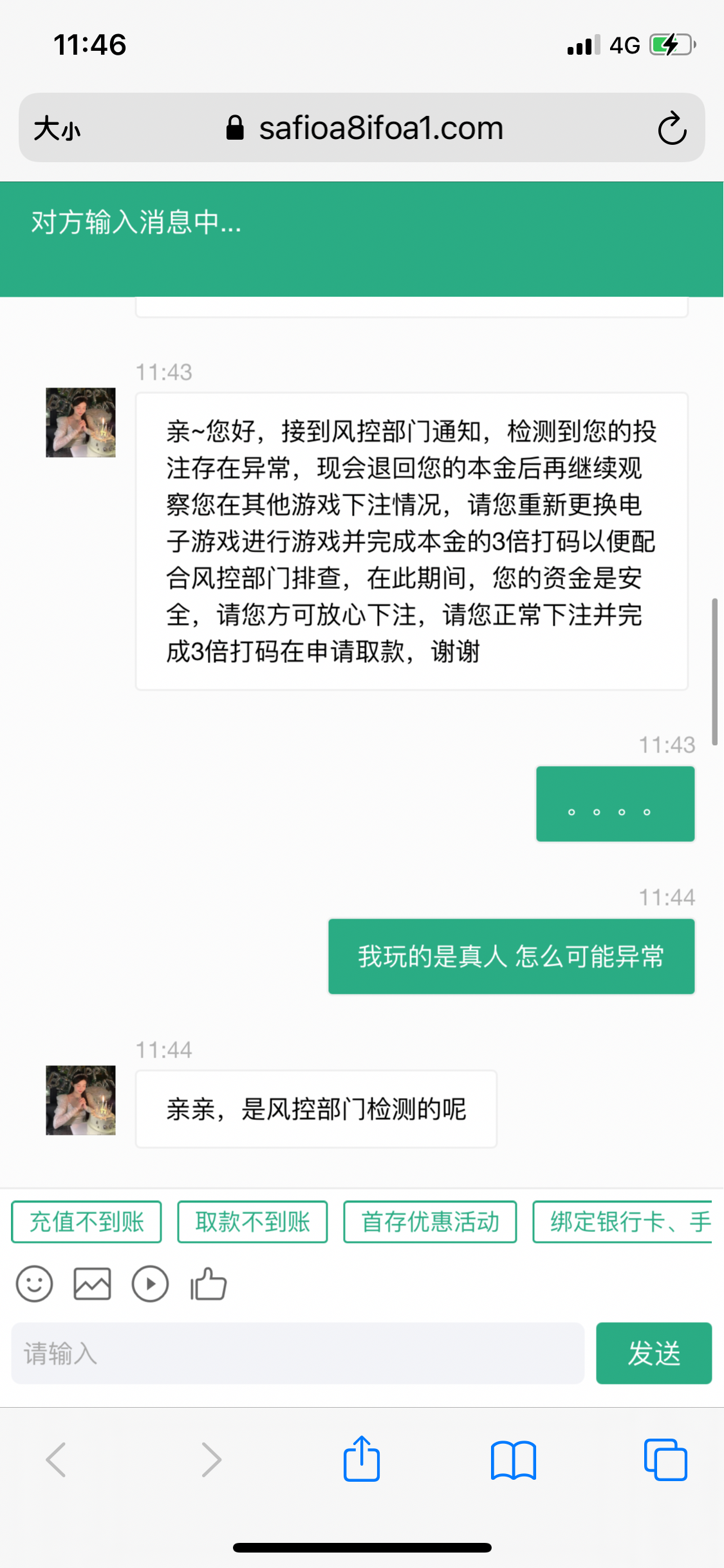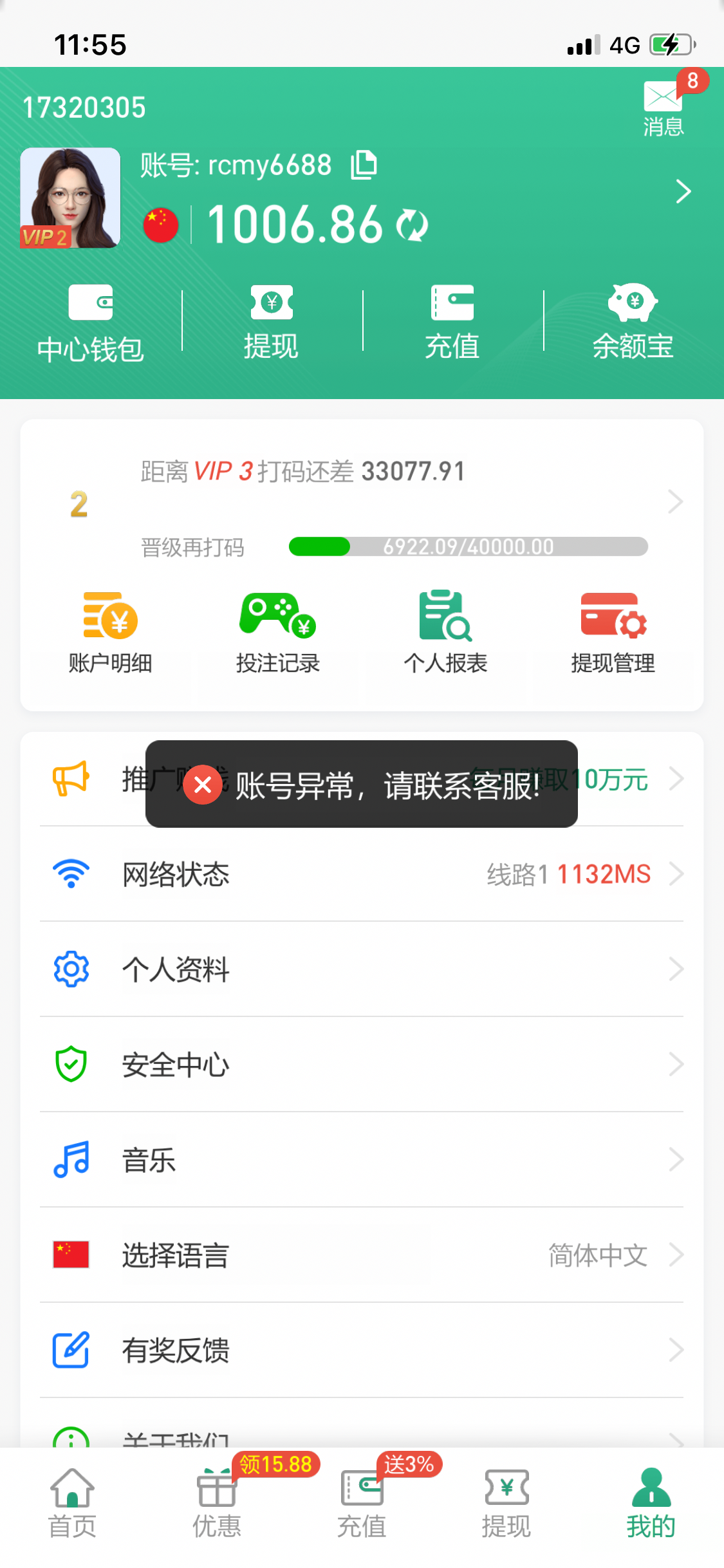 充一千输了在充一千玩真人盈利到3000提2600剩下400玩21赢到一千 2600没到账找客服说我账单异常连同账号的一千直接清0 退1000打3倍水 这平台就这点格局 论坛那些在这盈利一两万的绝对狗拖 拖这平台真畜生啊